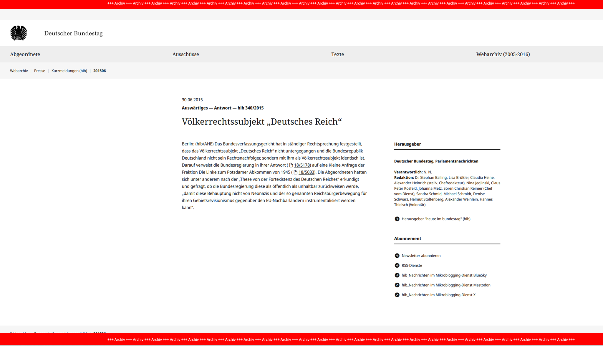 Berlin: (hib/AHE) Das Bundesverfassungsgericht hat in ständiger Rechtsprechung festgestellt, dass das Völkerrechtssubjekt „Deutsches Reich“ nicht untergegangen und die Bundesrepublik Deutschland nicht sein Rechtsnachfolger, sondern mit ihm als Völkerrechtssubjekt identisch ist. Darauf verweist die Bundesregierung in ihrer Antwort (18/5178) auf eine Kleine Anfrage der Fraktion Die Linke zum Potsdamer Abkommen von 1945 (18/5033). Die Abgeordneten hatten sich unter anderem nach der „These von der Fortexistenz des Deutschen Reiches“ erkundigt und gefragt, ob die Bundesregierung diese als öffentlich als unhaltbar zurückweisen werde, „damit diese Behauptung nicht von Neonazis und der so genannten Reichsbürgerbewegung für ihren Gebietsrevisionismus gegenüber den EU-Nachbarländern instrumentalisiert werden kann“.